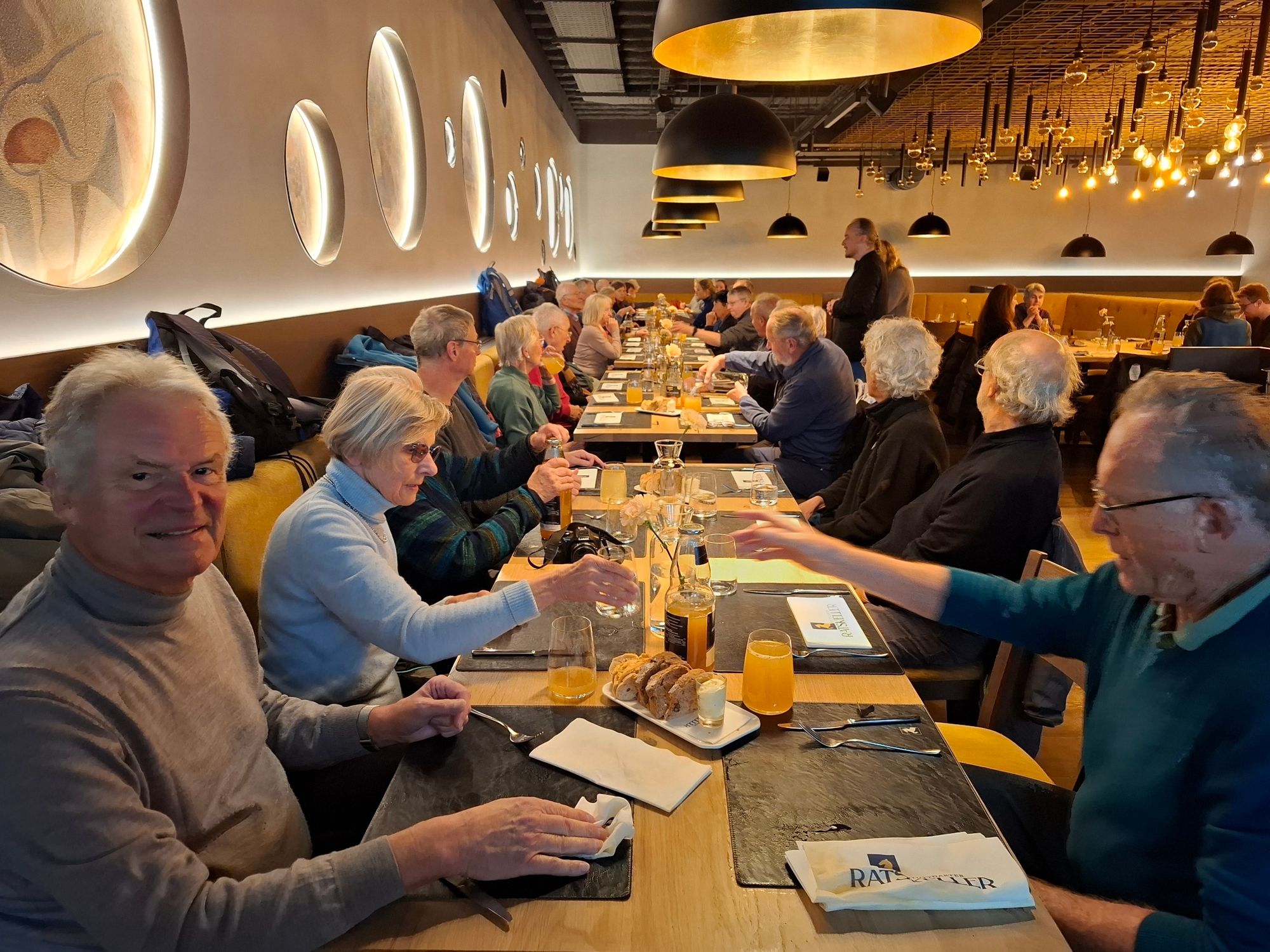 Nach dem Maultaschenessen im „Ratskeller“wurde die Gruppe vom Besucherdienst des Landtags empfangen. Bei der anschließenden Führung standen die Architektur und die verschiedenen Kunstwerke des Landtagsgebäudes im Zentrum. So erfuhren die Gäste, dass es sich bei der Treppe im Landtagsgebäude um eine „Schreittreppe“ handelt, eine Art die üblicherweise in Schlössern verbaut ist, dass das Gebäude durch das viele Glas sehr transparent wirkt und dass es sich beim „Pferdle“ um die Skulptur „Il Miracolo“ des Mailänder Bildhauers Marino Marini (1901-1980) handelt, die ganz im Eindruck des Kalten Krieges entstanden ist. Empfangen werden Gäste im Foyer von der Büste von Eugen Bolz, des württembergischen Staatspräsidenten (1928-1933), der im Dritten Reich, am 23. Januar 1945, hingerichtet wurde.