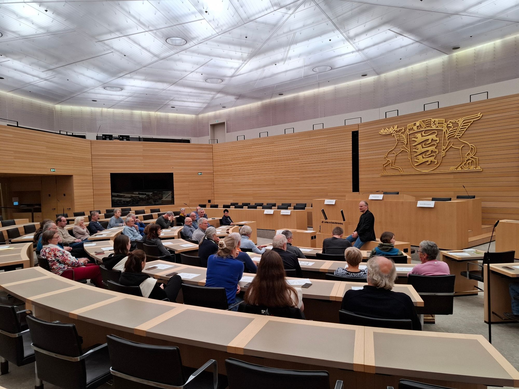Danach wurden die Besucher in den Plenarsaal eingeladen um dort mittels eines Rollenspiels den Ministerpräsidenten zu wählen. Bevor der Heimweg nach Emmendingen getreten wurde, stellte Rüdiger Tonojan im Abgeordnetengespräch seine Arbeit vor und beantwortete Fragen.
